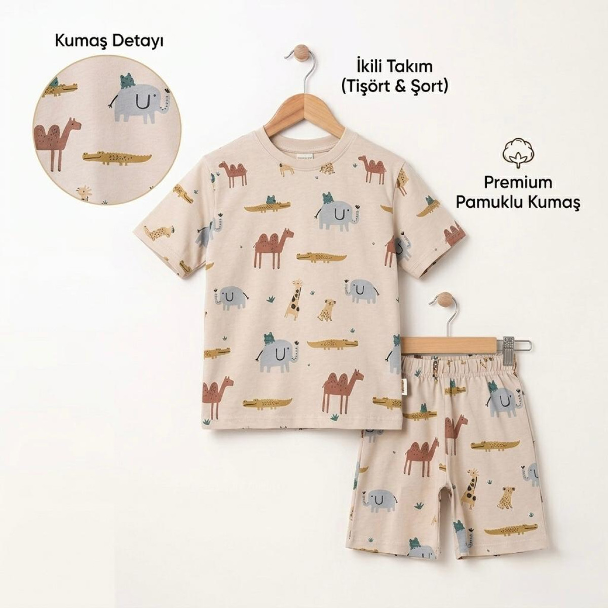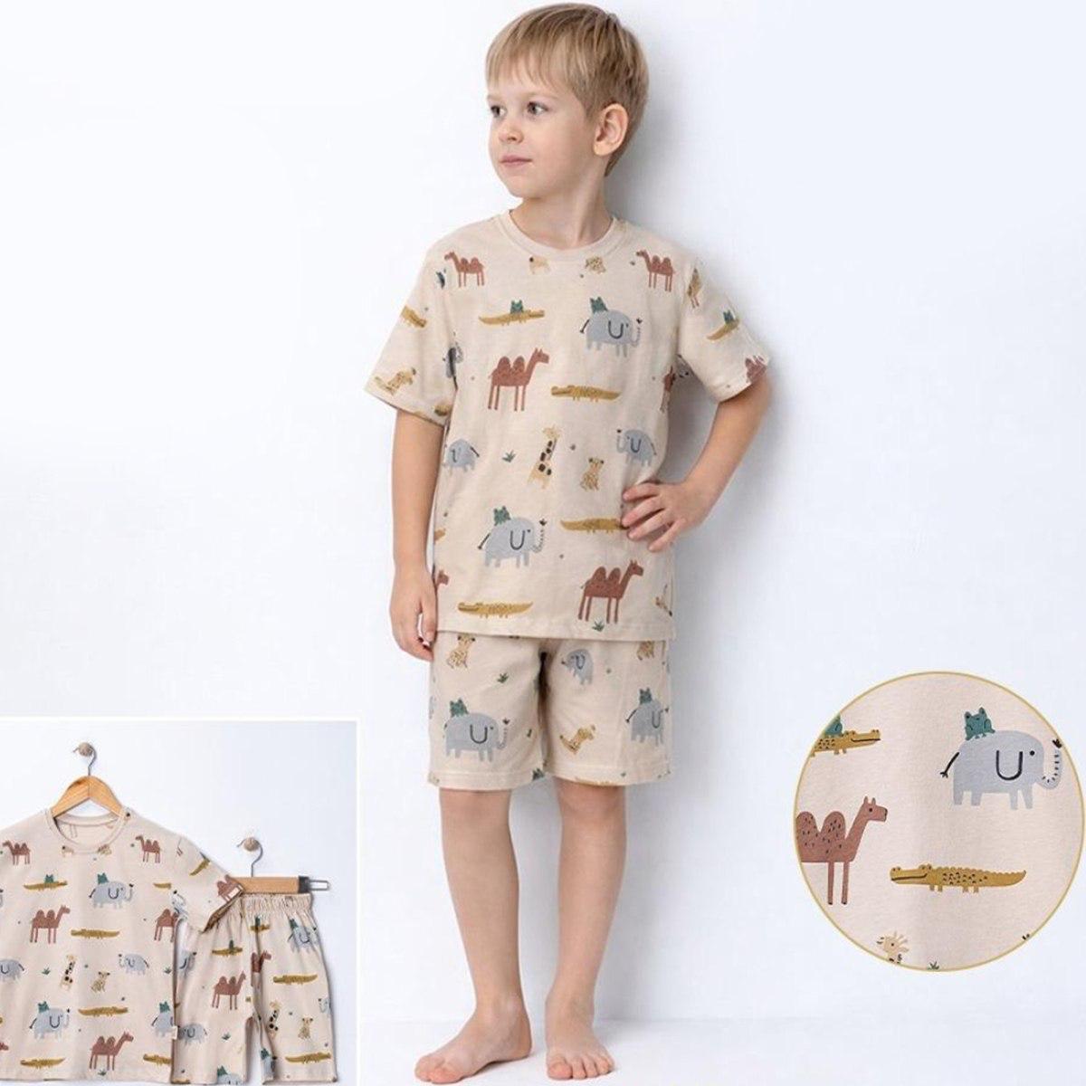 2-5 Yaş Erkek Çocuk Takımı – Safari Desenli Pamuklu Tişört Şort Bej