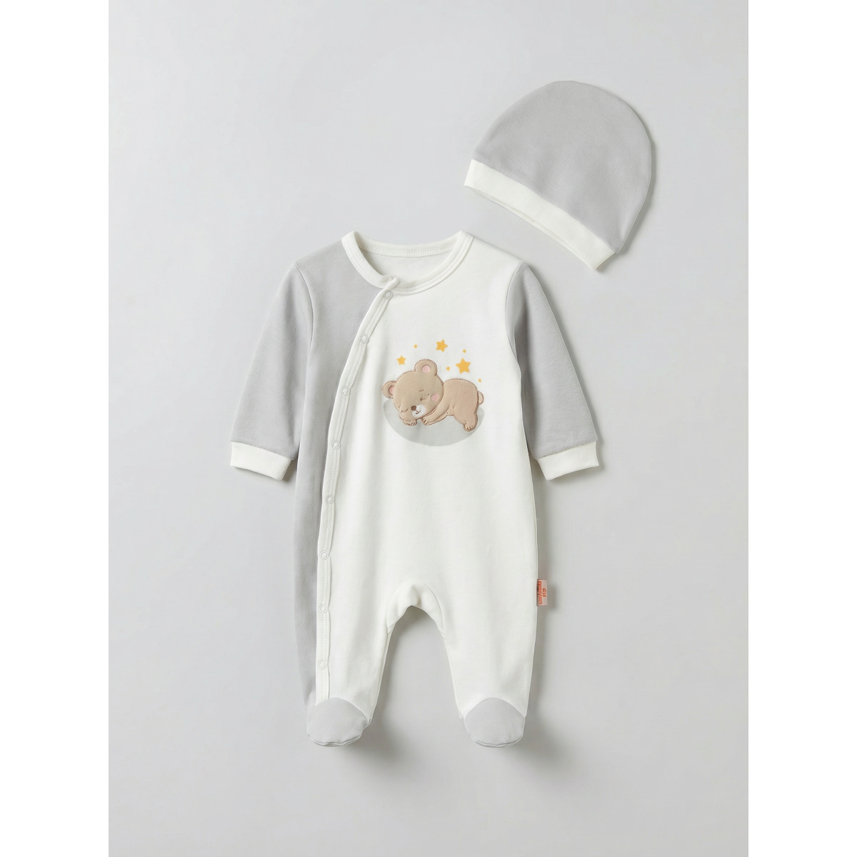 Pamuş 0-3-6 Ay Yıldızlı Ayıcık Penye Erkek Bebek Tulum Gri